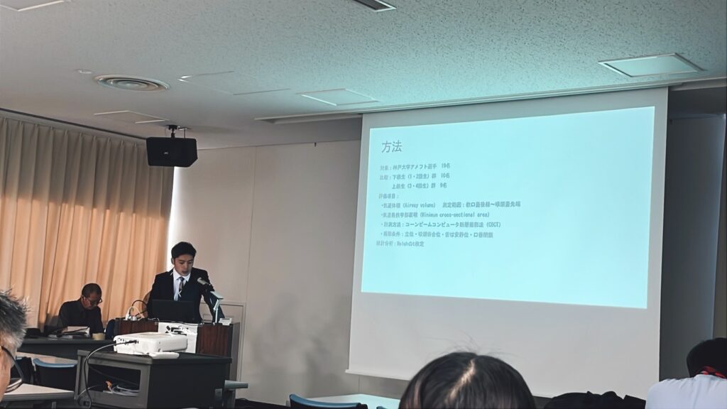 今回は、ただ歯を守るだけではなく、“スポーツ選手のパフォーマンスをより良い状態で保つために歯科ができること”をテーマに、研究内容を報告しました。