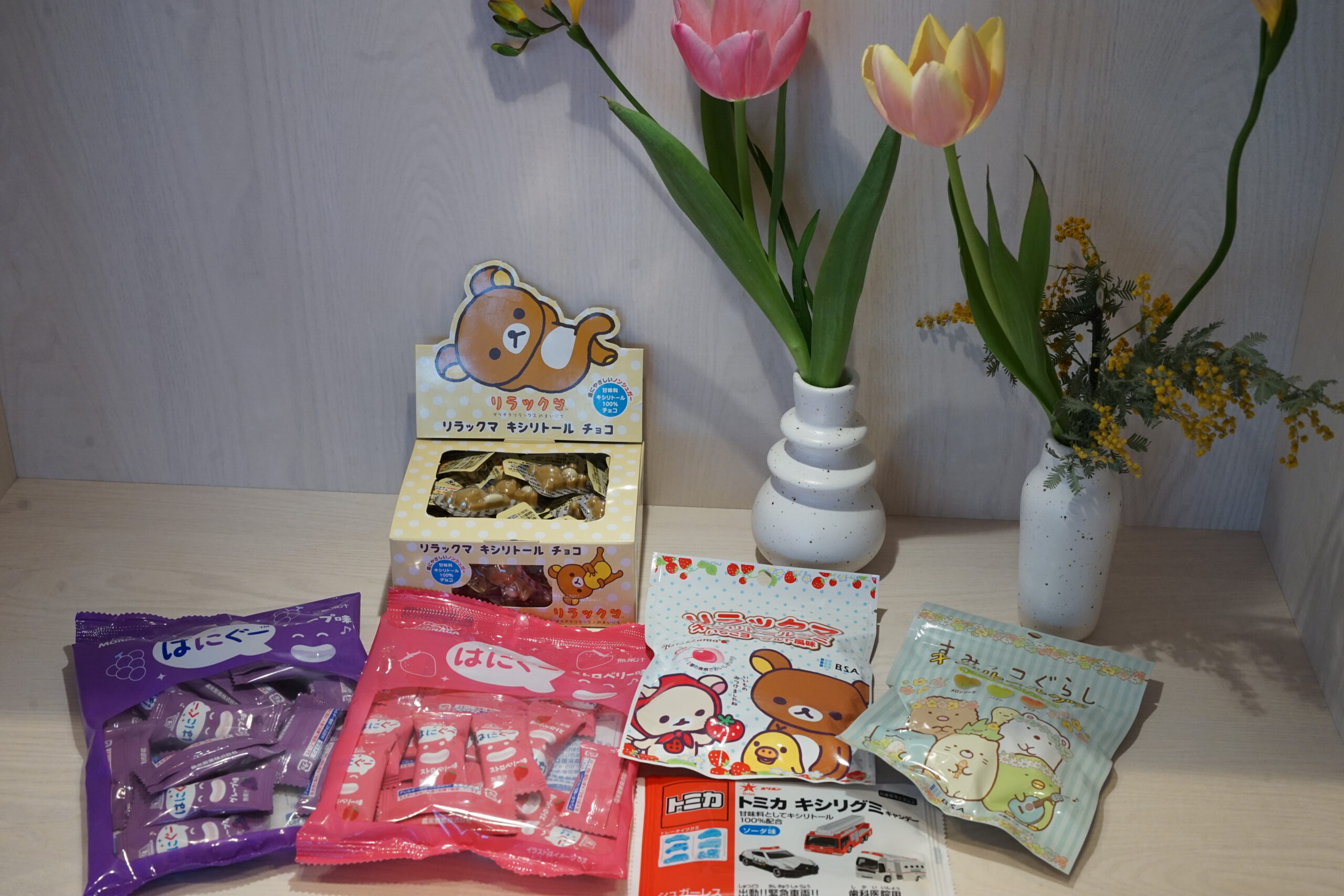 当院では、むし歯になりにくいお菓子として、キシリトール100%配合のグミやチョコレートを販売しています。キシリトールはむし歯菌のエサにならず、むし歯の原因となる酸を作らせない甘味料です。